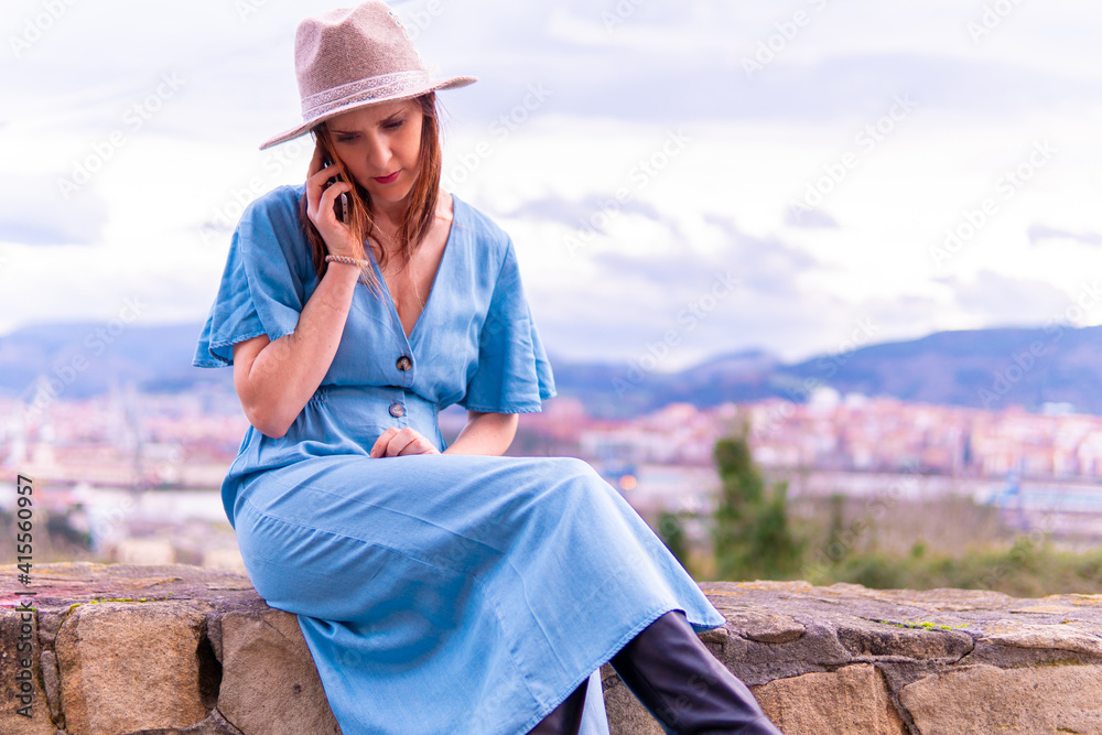 Young beautiful middle-aged woman talking on smartphone in spring wearing blue dress and hat.