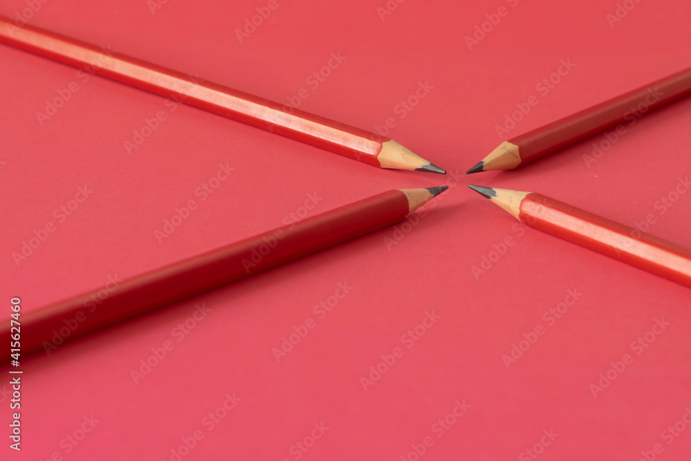 Lápices color rojo con fondo rojo pastel. Grupo, equipo. Conceptual