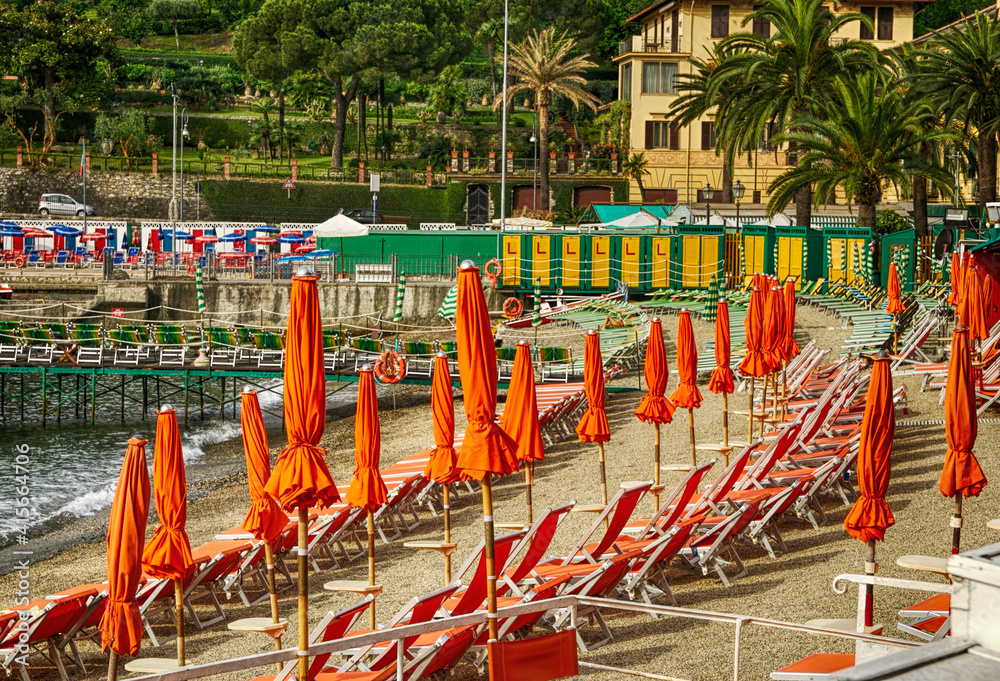Rows of orange beach chairs and umbrellas in Rapallo, Italy