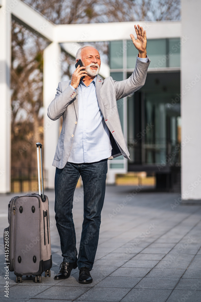 Senior businessman is arriving at bus station. He is calling taxi.