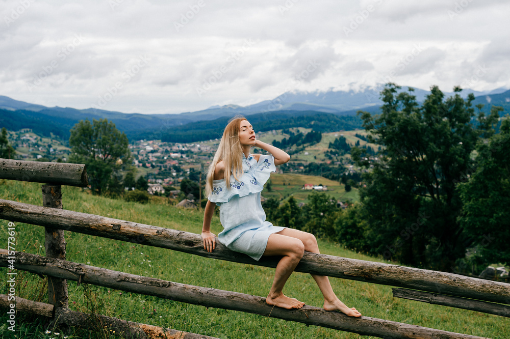 Young attractive elegant blonde girl in blue romantic dress sitting on the wooden fence in the countryside