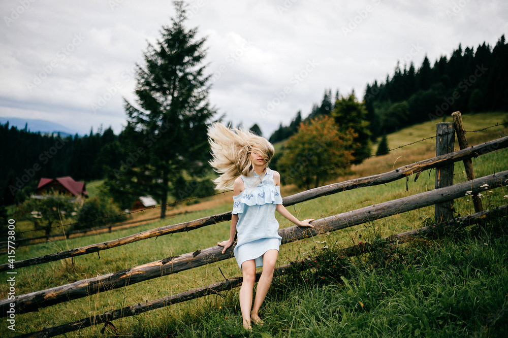 Young attractive elegant blonde girl in blue romantic dress with flying hair posing near fence in the countryside