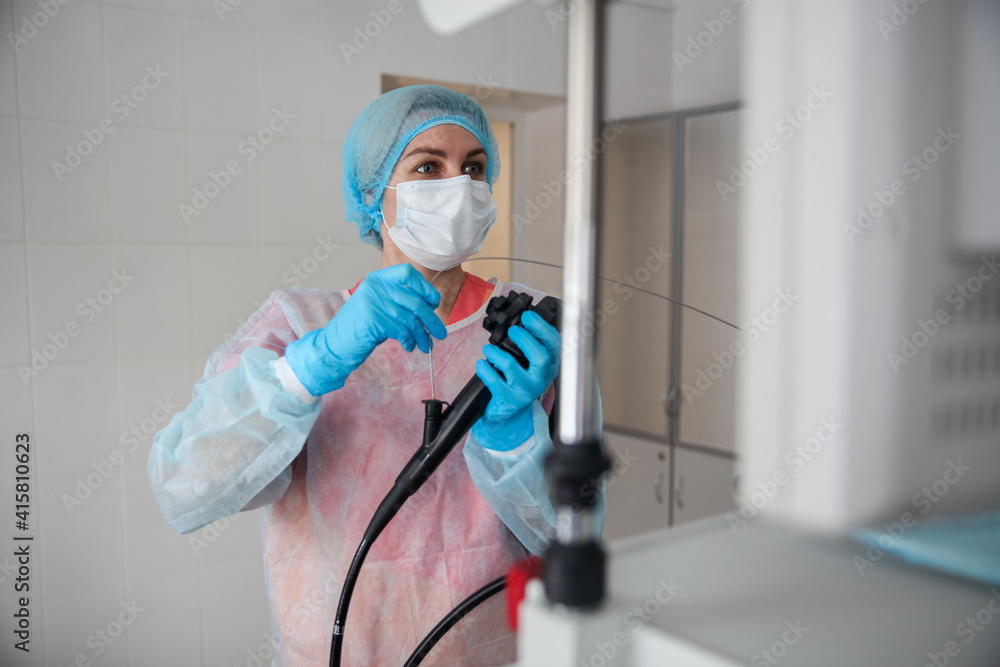 A female endoscopist surgeon in a protective suit, cap, mask and gloves holds an endoscope in front of a monitor