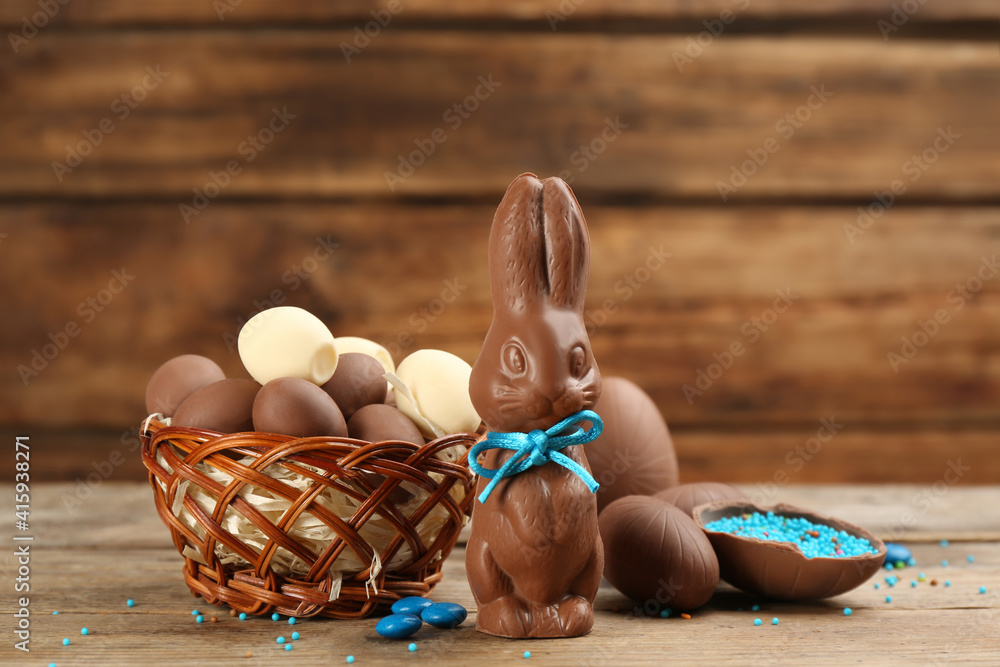 Chocolate Easter bunny with blue bow and eggs on wooden table