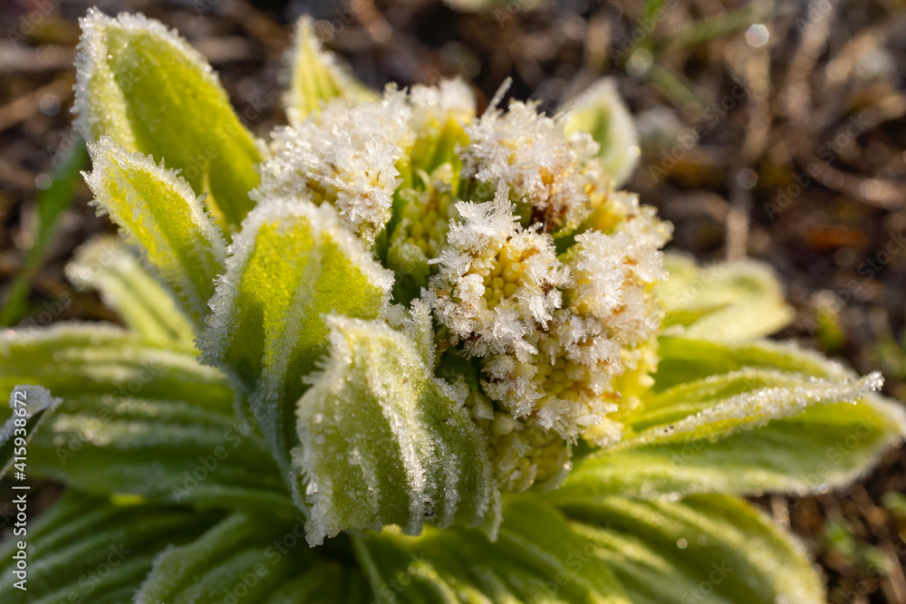 フキノトウの芽に霜のクローズアップ