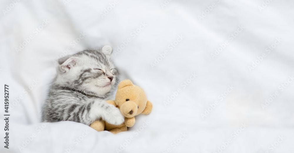 Cute kitten sleeps under warm white blanket on a bed at home and hugs favorite toy bear. Top down view. Empty space for text