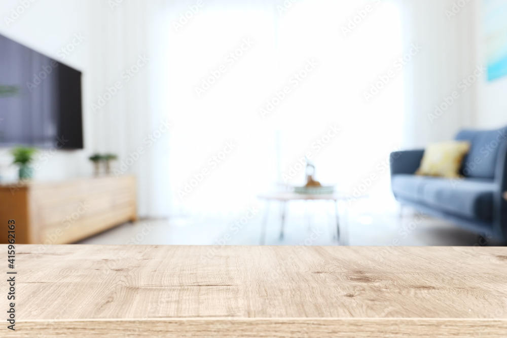 Wooden empty table in front of Living room sofa interior. For product display and presentation