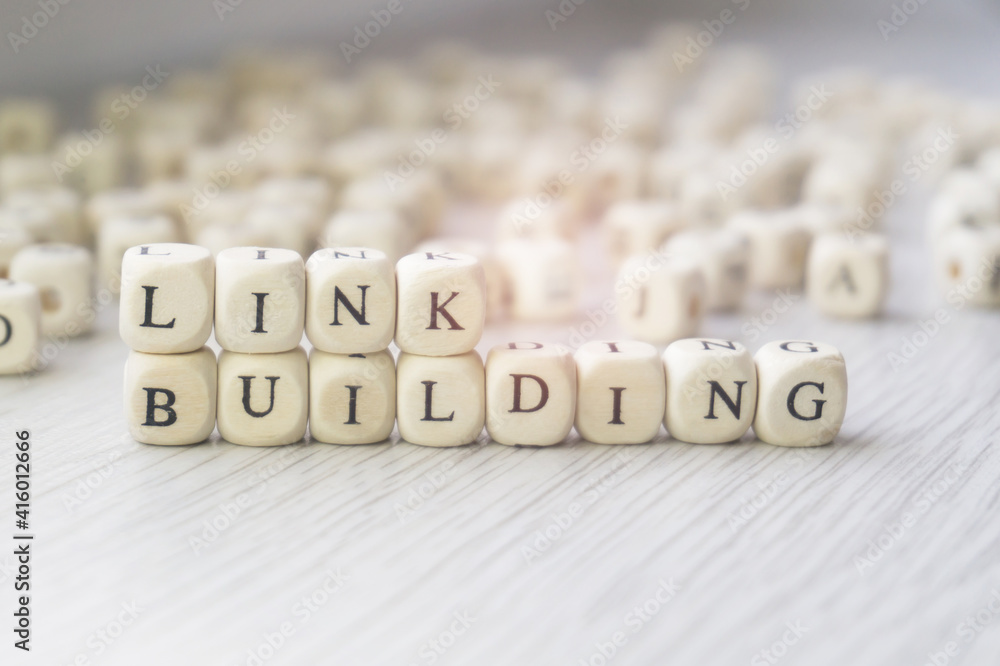 Link building words written in wooden cubes next to a pile of other letters. Backlinks concept, Search engine optimization, Off-page SEO term