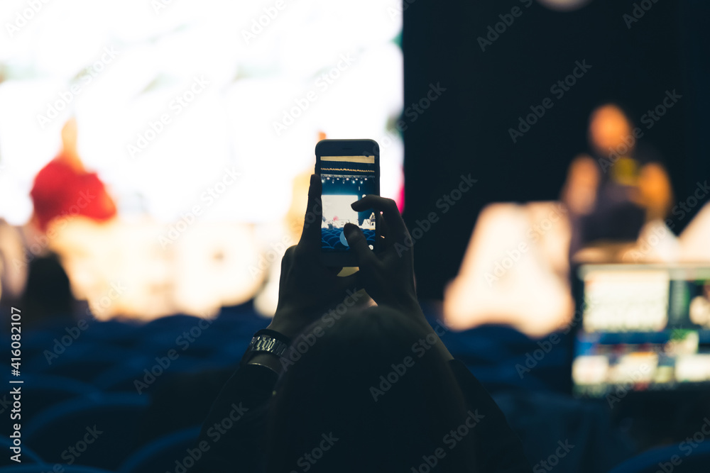spectator photograph speakers on stage with their mobile phone. shooting video or photo with smartphone