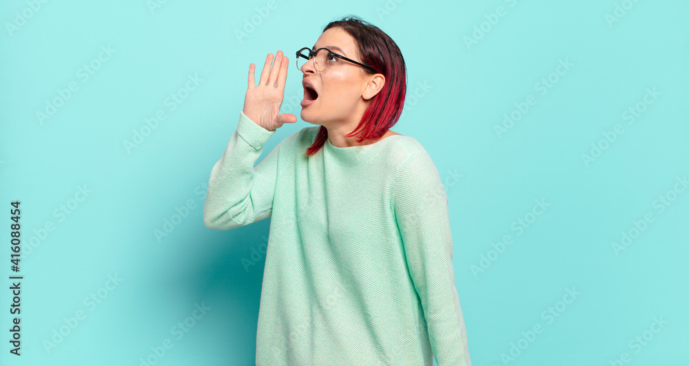 yelling loudly and angrily to copy space on the side, with hand next to mouth