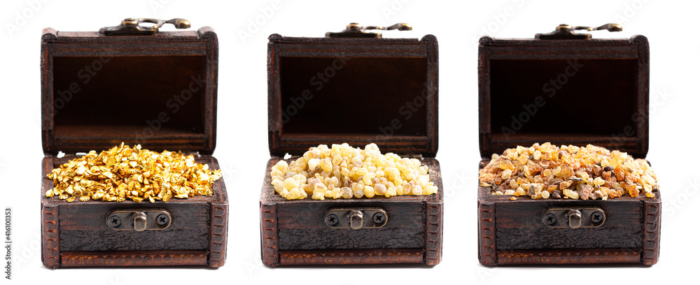 Gold Frankincense and Myrrh in three Chests on a White Background