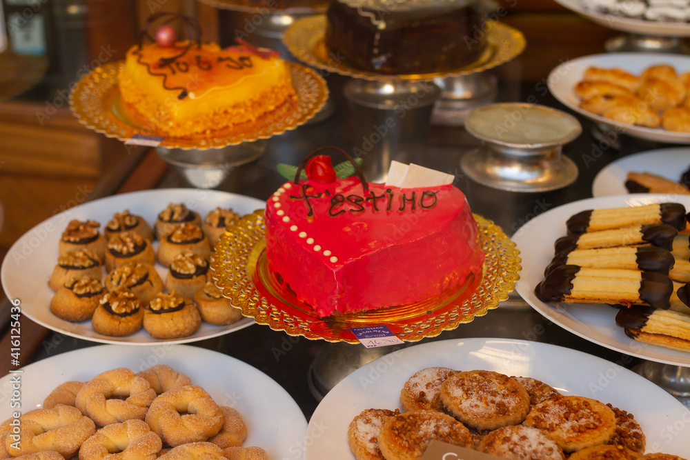 Different types of sweets in the window for sale, concept gastronomy desserts