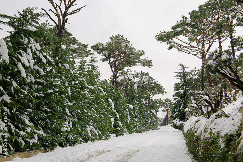 Winter mountain in Bzebdine village - landscape with snow, beautiful nature panoramic background. Lebanon - February 21, 2021.