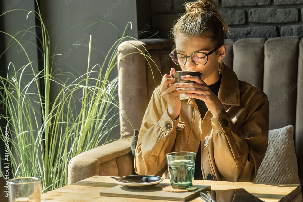 Young woman drinking coffee cup and sitting in cafe. Girl in glasses pauses after work.