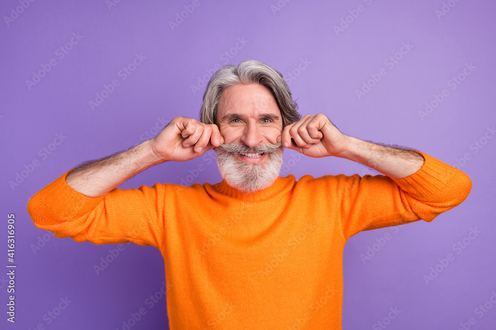 Photo of aged man happy positive smile hands touch mustache funky cool isolated over violet color background