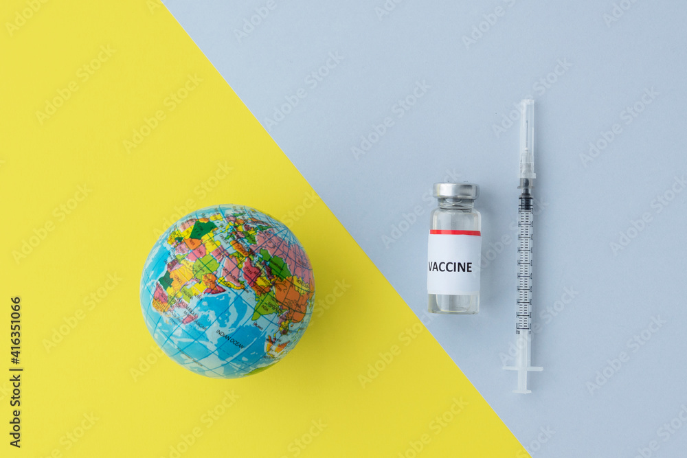 Top view of toy glose, vial with vaccine, and syringe on background from colors of 2021, yellow and grey. Vaccination concept
