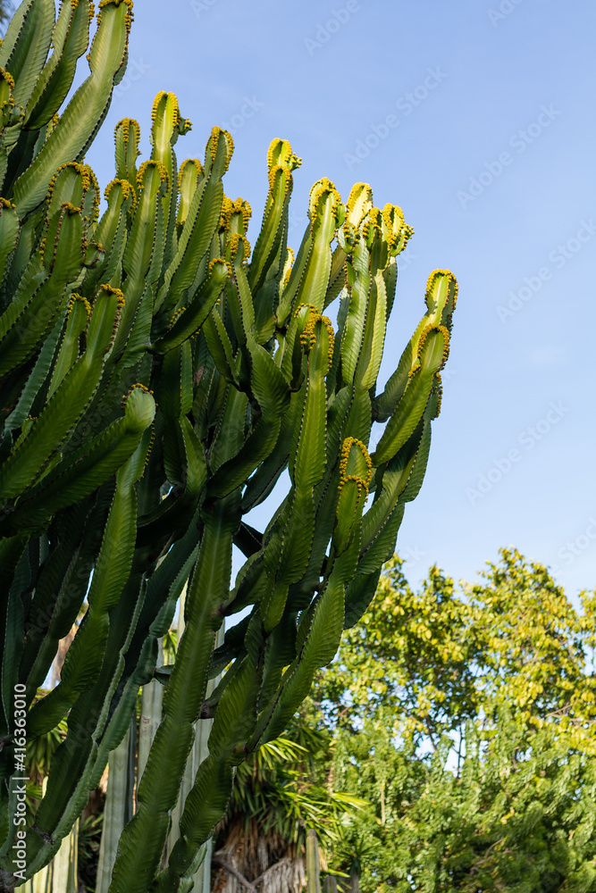 Euphorbia candelabrum, elongated green cactus with blue background, flora concept
