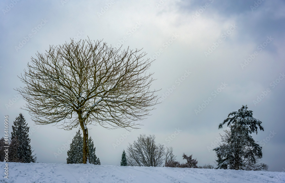 A snowy Stanley Park with a bare tree in the foreground
