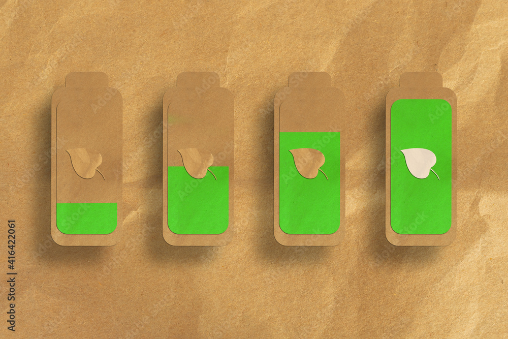 Concepto de energía limpia, verde. Baterías con hoja. Cargando. Ambiente. Textura de papel. Concepto casero