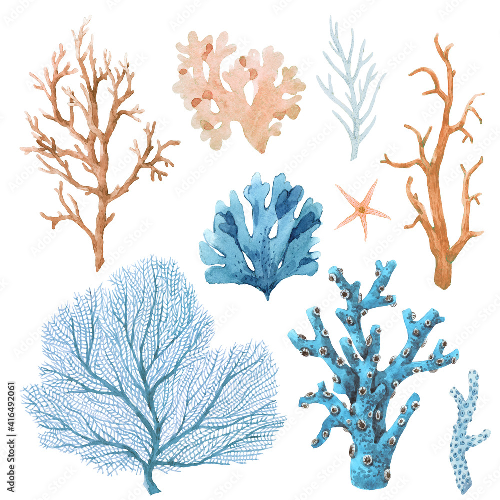 Beautiful set with watercolor hand drawn coral illustrations. Sea underwater life.