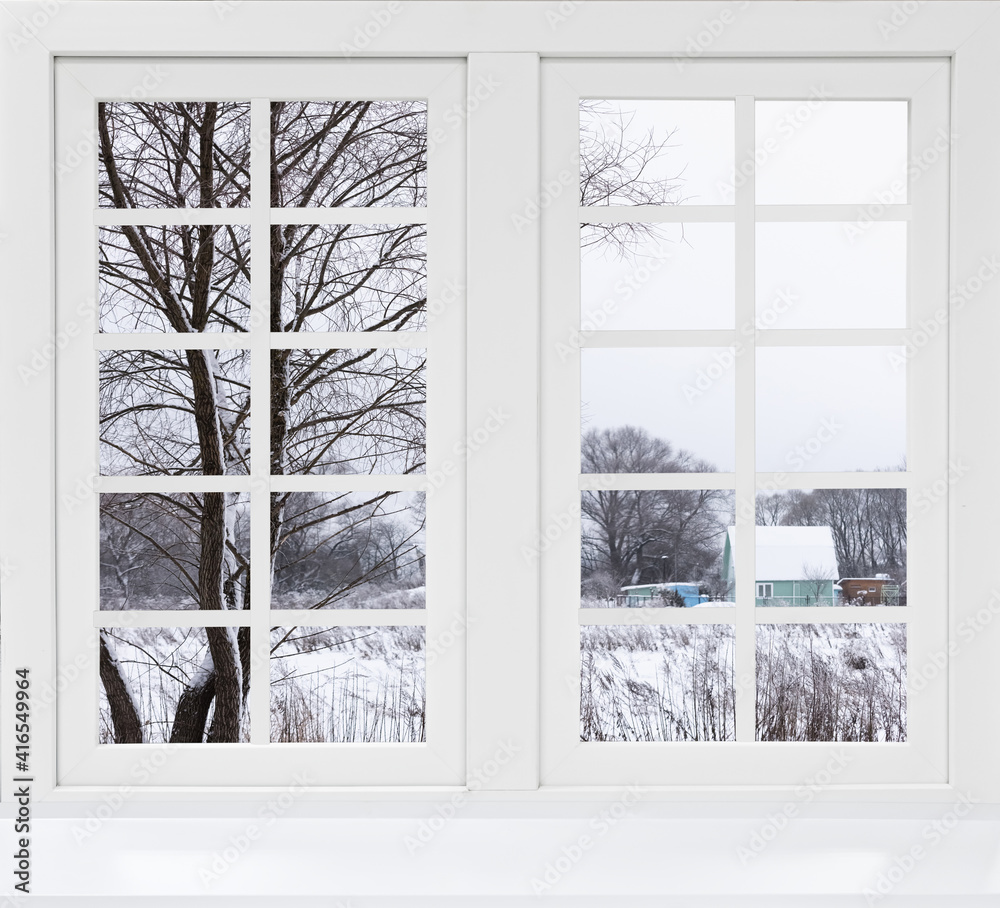 view from the window to the snow-covered trees