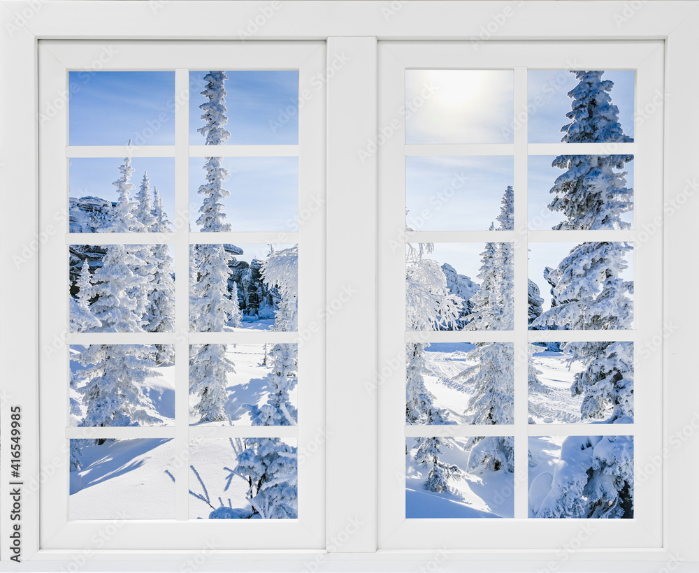 view from the window to the snow-covered trees