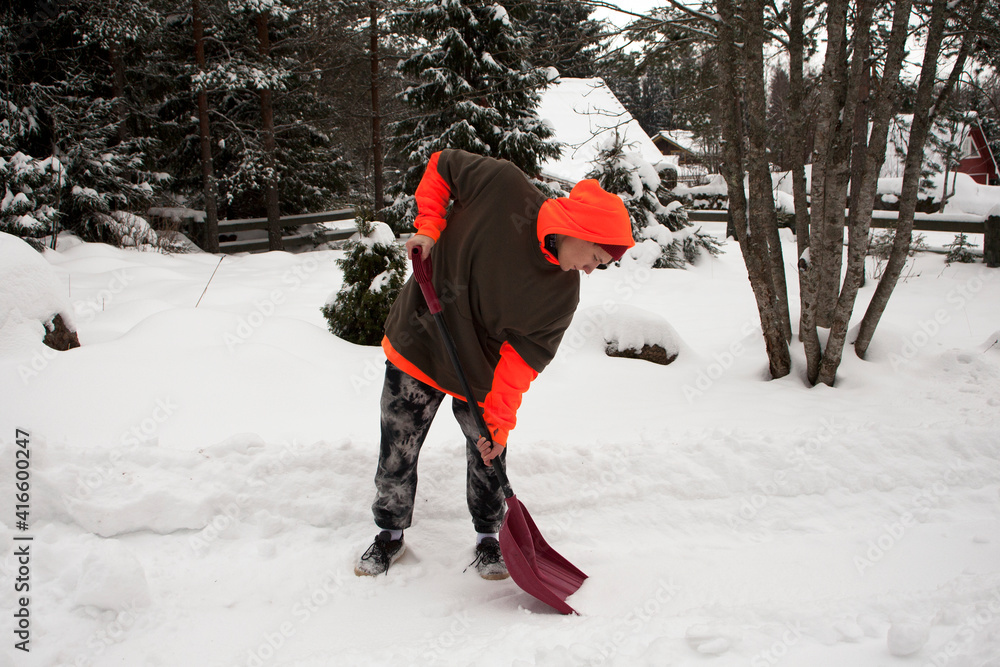 Young man cleans the yard after a snowfall. guy shoveling snow.