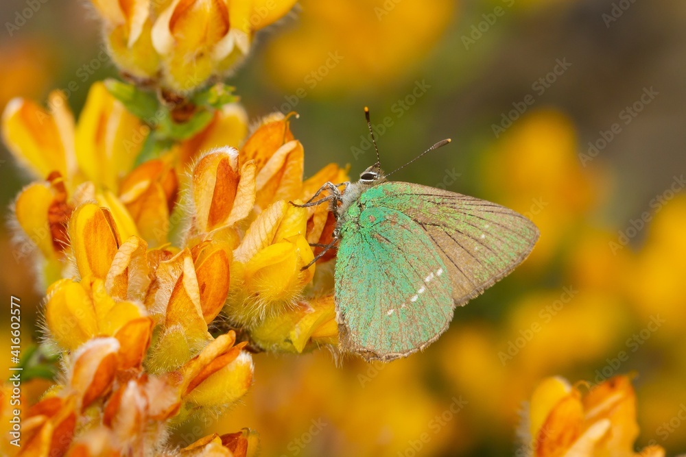 Green hairstreak (Callophrys rubi), small green butterfly on yellow flowers