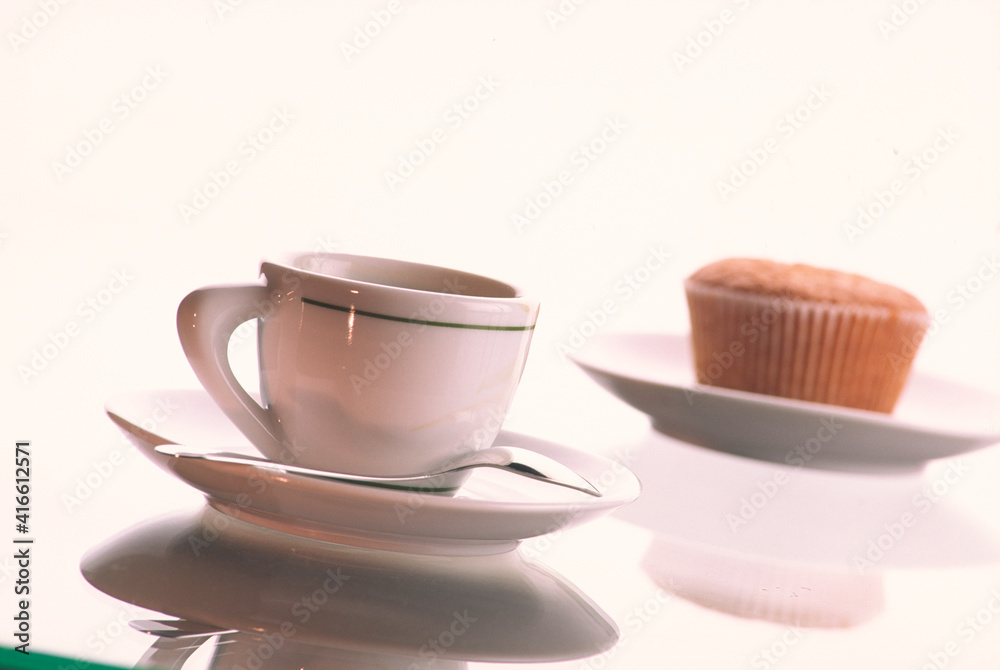 Cupcake in a plate on a blurred light background and a coffee cup with a spoon in a plate.