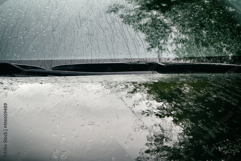 Water droplets on a metal surface. Black car hood fragment and windshield wipers with raindrops on it, closeup
