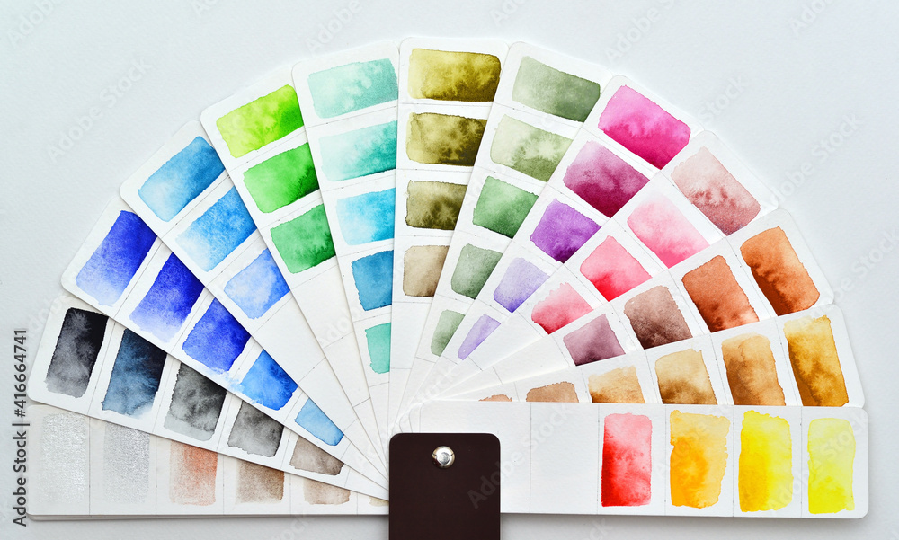 The color palette is a semicircle made of white watercolor paper with painted rectangles.