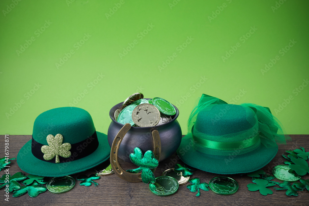 Happy St. Patrick's day. Shiny shamrocks, gold coins and leprechaun hat on a wooden background
