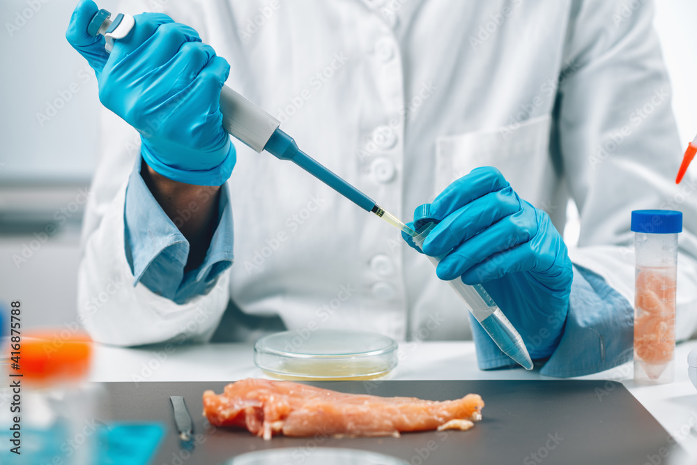 Food Safety and Quality Assessment. Microbiologist Testing Poultry Sample for the Presence of Salmonella and E.Coli