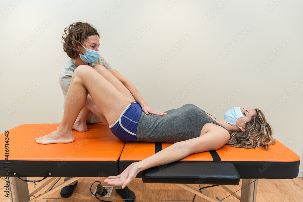 Physiotherapist and patient in Global Postural Re-education session, with pandemic protection mask.