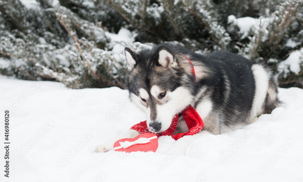 Lying alaskan malamute dog in red scarf with heart gift box. Valentine day.