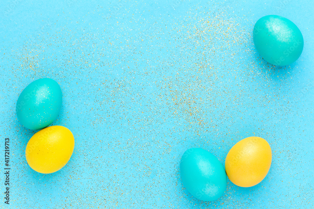 Minimalist Easter composition. Colorful easter eggs and glitter on pastel aquamarine background. Top view, copy space.