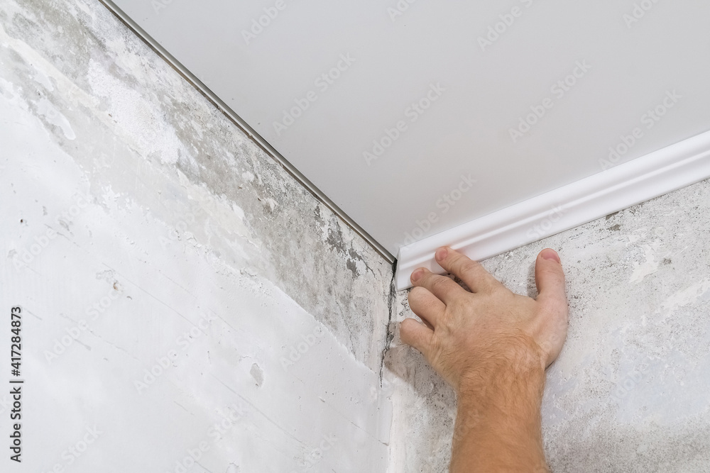Worker fixes the plastic molding to the ceiling. Installation of ceiling cornice.