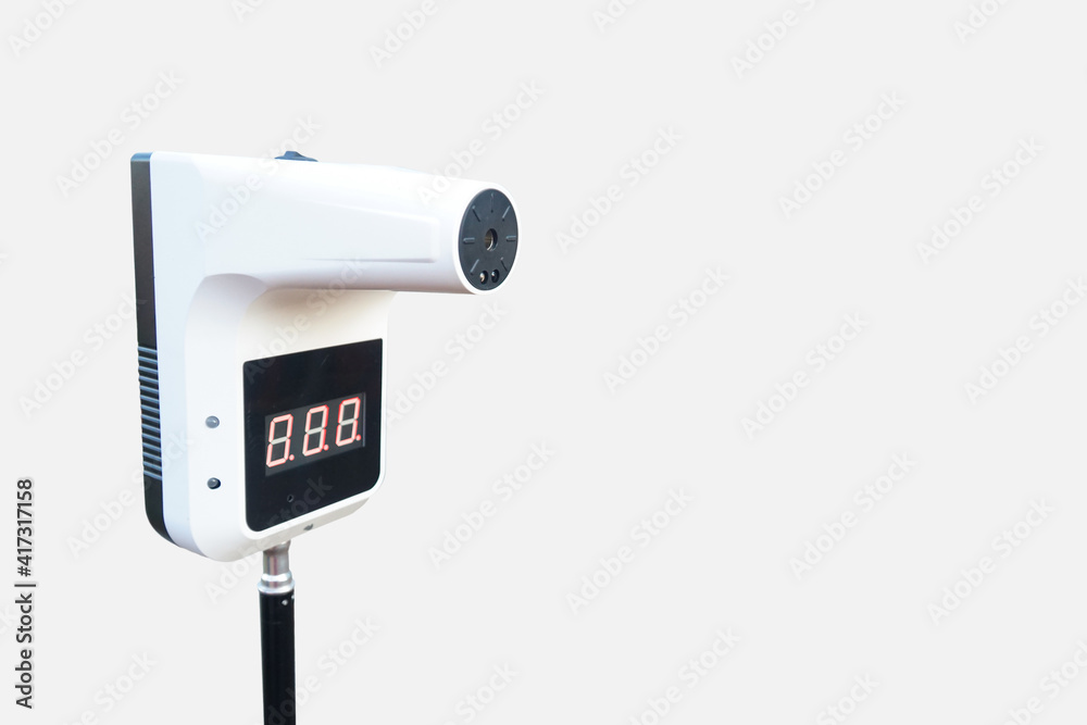White thermometer head measuring on palm angled face concept covid-19 body temperature measuring device on white background.
