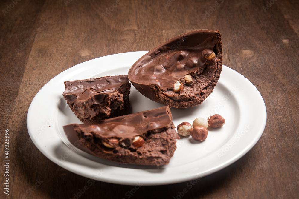 Cracked stuffed chocolate and hazelnut easter egg on a white plate on a wooden table.