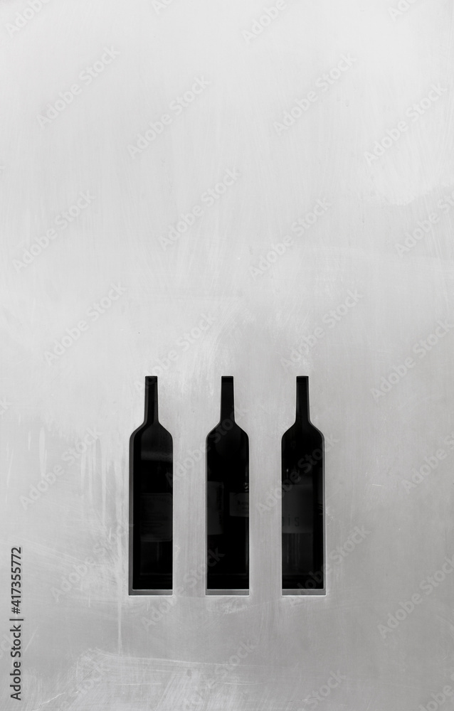 Stainless steel panel with a cut out wine bottle. Laser cut icon. Edelstahl-Paneel mit einer ausgeschnittenen Weinflasche. Symbol Lasergeschnitten.