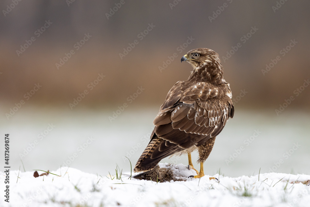 Common Eurasian buzzard buteo buteo in snow looking over its shoulder with beautiful blurry background in snow, Schleswig-Holstein, Northern Germany