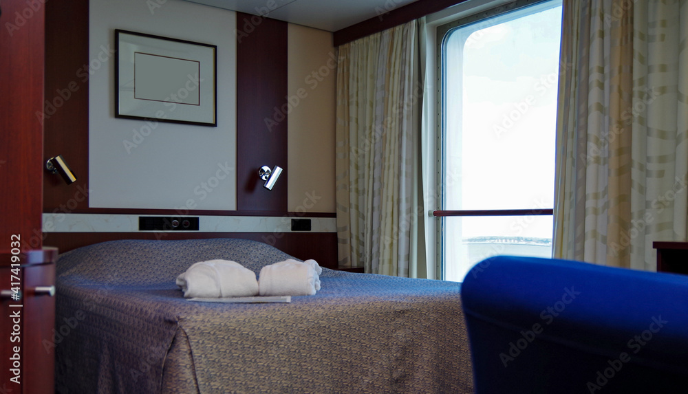 Luxurious ocean view or oceanview or outside or exterior cabin on luxury cruiseship yacht or cruise ship liner in clean minimalistic modern interior design with bed, armchair, bathrobes and porthole