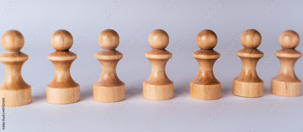 Close up of white wooden chess pieces. Row of white pawns on white background.