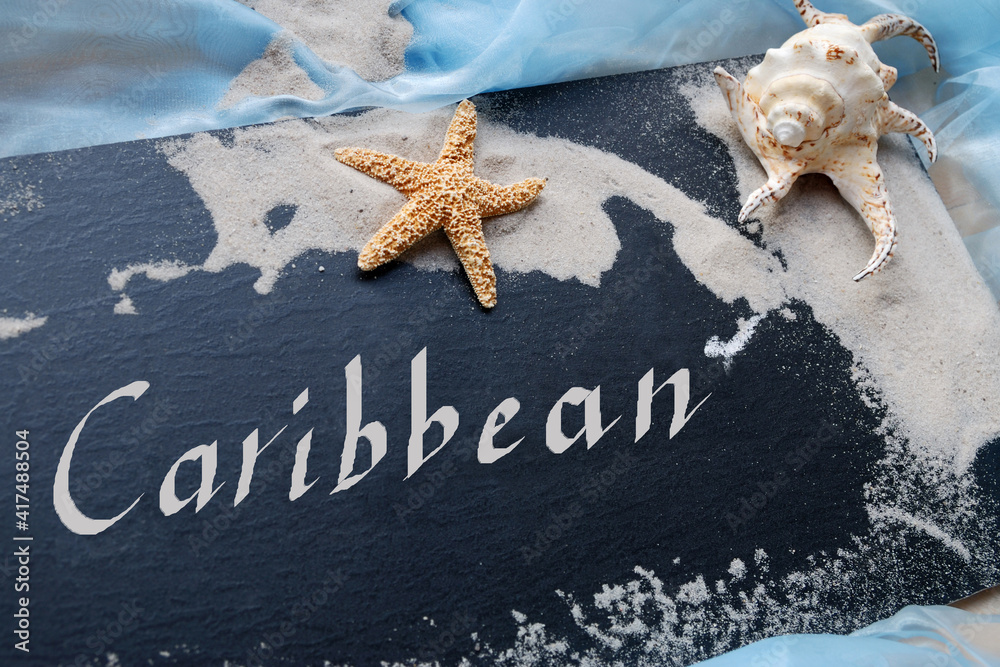 starfish, seashells and a chalkboard with the written word "Caribbean"
