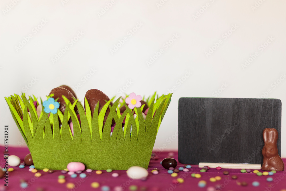 Easter basket with chocolate eggs, chocolate bunny and blackboard with copy space