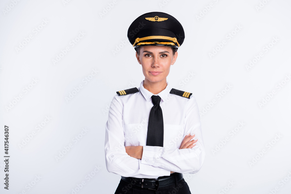Photo of lovely successful pilot lady folded hands wear hat aviator uniform isolated white color background
