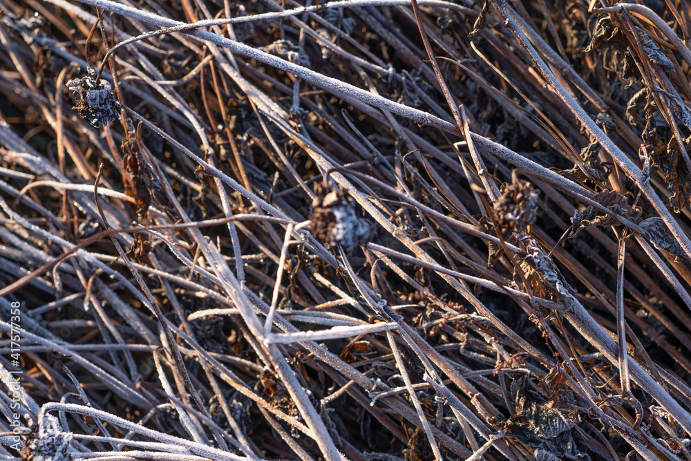 Stack of twigs in the sunlight with ice.Burning branches in winter.