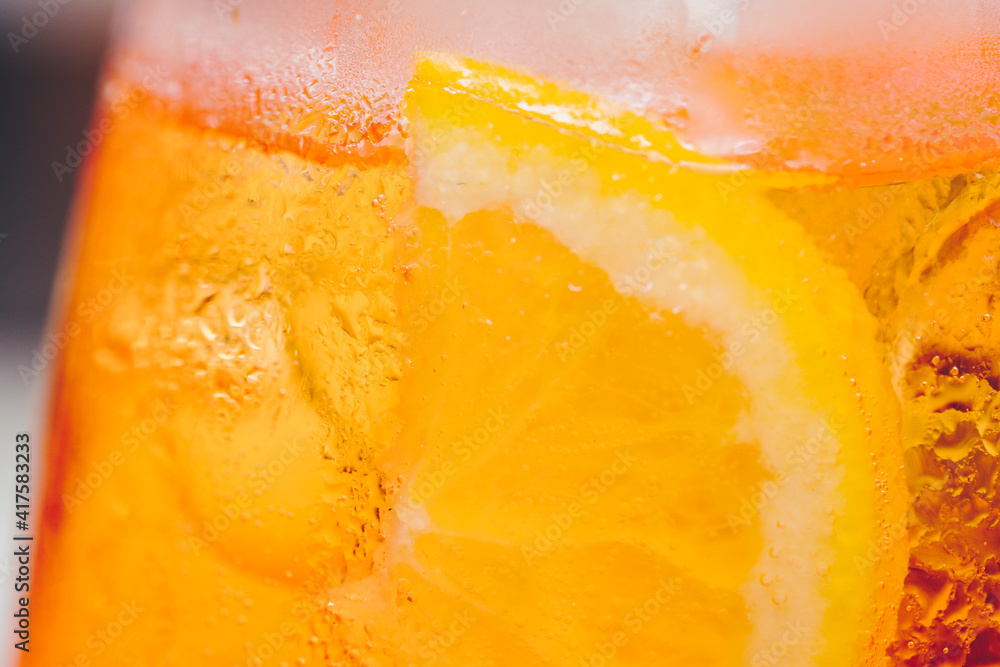 Glass of ice cold Aperol spritz cocktail served in a wine glass, decorated with slices of orange. Aperitif in street caffe in Italy