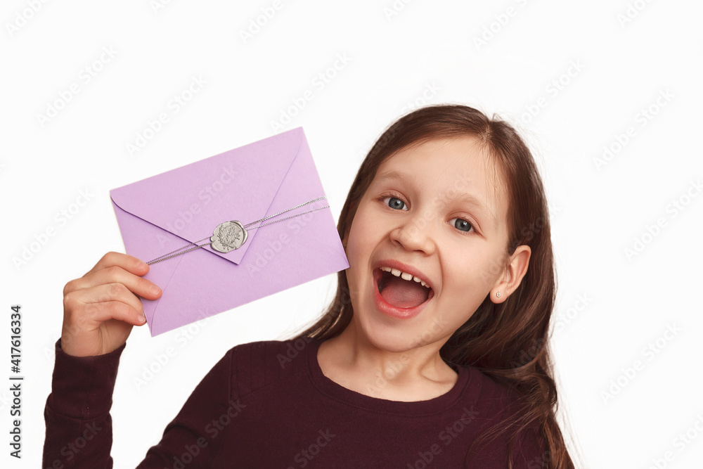 Little girl with her mouth open with joy. Baby with a gift envelope on a white background