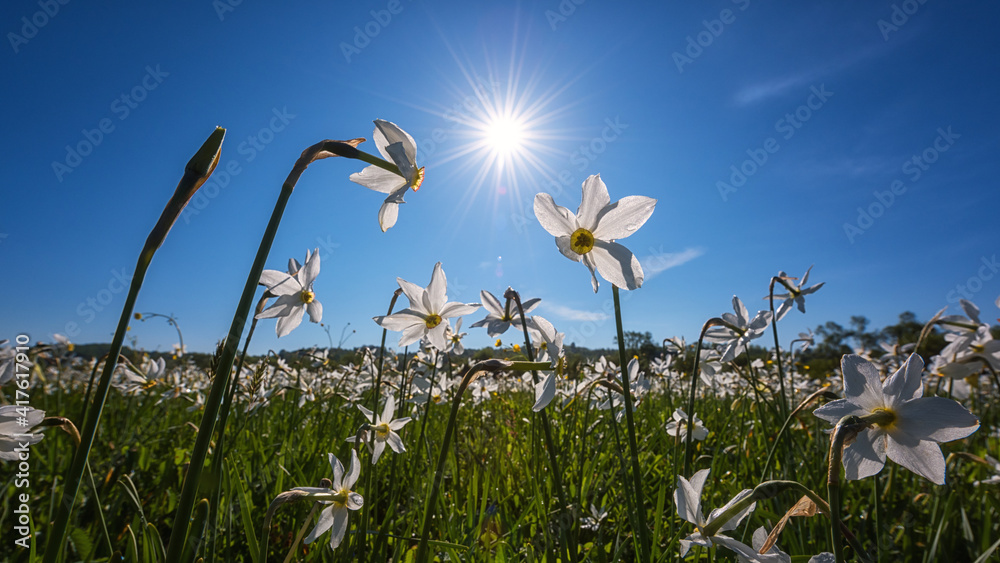 Amazing spring landscape with beautiful white narcissus flowers against blue sky background and star shaped sun, beauty of nature